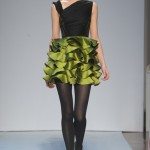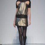 *Il pezzo forte*: L’abito color bronzo con le spalle semiscoperte, che è ispirato al mond del jazz e degli anni ’20. Realizzato in mikado e organza, è corto e geometrico, con delle applicazioni che si distinguono per il colore nero. Per le più coraggiose, il mini dress è da indossare con le autoreggenti.