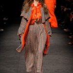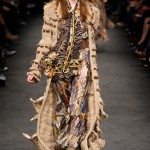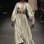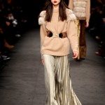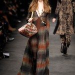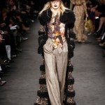 Woodstock. Non ci saremmo sorpresi se, accanto a Chiara Ferragni, avessimo trovato, seduto in prima fila, Jimi Hendrix con la sua chitarra. E’ assolutamente figlia dei fiori la donna di Angelo Marani per il prossimo Autunno/Inverno. Una profusione di pantaloni ampi o a zampa, gonne e abiti lunghi, abbinati a maxi cappotti a balze in maglia di cashmere. Pesca nell’armadio della mamma sessantottina: molti foulard, uno sopra l’altro, a cui sono intrecciate collane di pietre dure e luminose, cappelli per proteggersi dal freddo e gilet di pelliccia. Il freakettonismo imperante nella collezione viene mescolato a sorpresa ( e che sorpresa! ) con elementi ultra luxury come i tessuti in broccato color oro o ricoperto da una pioggia fitta di paillettes. E poi ancora stampe geometriche, leopardate, zebrate, pitonate audacemente mixate insieme…ma non s’era detto che “Less is more”?