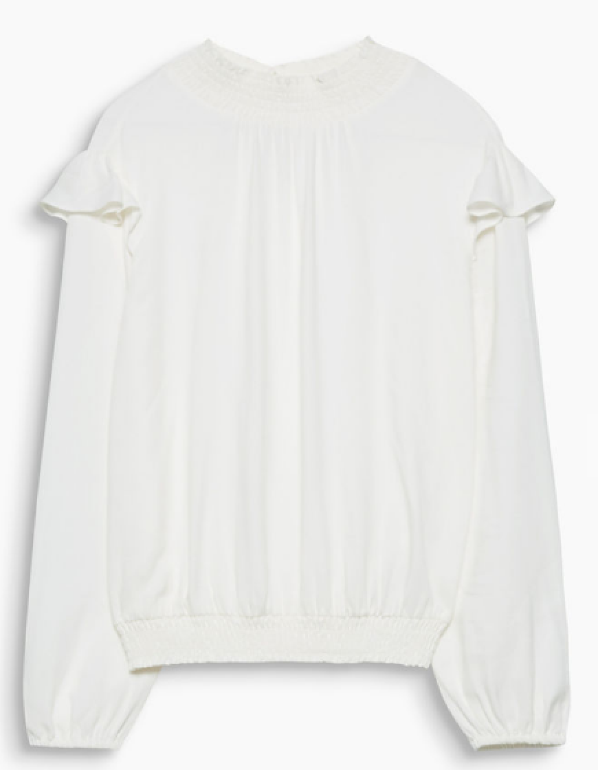 Schermata 2017-09-26 alle 09.26.53 5. La blusa romantica. Bianca, in crepe con maniche lunghe e alette sulle spalle. E, intorno al collo, punto a nido d’ape. Femminile ma non troppo leziosa. 45,99