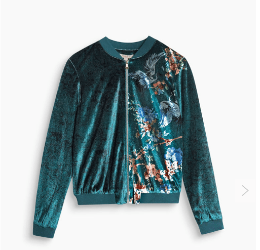 bomberricamato1.Il bomber di velluto con decoro di fiori: va bene di giorno, sopra a una T-shirt e dei jeans ma anche di sera sopra un abito e sotto un cappotto perché è cangiante e brillante. 89,99
