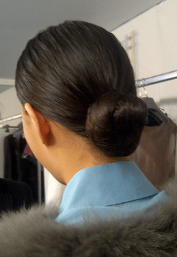 Austero, elegante, eppure semplicissimo. E’ lo chignon scelto da Alberta Ferretti per accompagnare i suoi abiti leggeri e romantici (in nero, in viola acceso, in rosso) ma le giacche più castigate e maschili. Lo chignon è pieno, rotondo e basso sulla nuca, tenuto insieme da una invisibile retina. Ed è bellissimo con gli abiti da sera, specie se scollati anche dietro. Da provare!