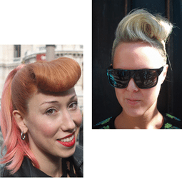 Interpretazioni diverse di un ciuffo a “banana”. A sinistra la frangia gonfiata in sotto, ha un aspetto rétro, reso meno banale dal colore rame-rosato dei capelli e puntualizzato dal rossetto rosso da pin up. A destra l’intero ciuffo fissato a banana sulla testa ha un aspetto molto metropolitano, quasi punk – non fosse la rotondidtà del “riporto”. Gli occhiali a mascherina definiscono il look.