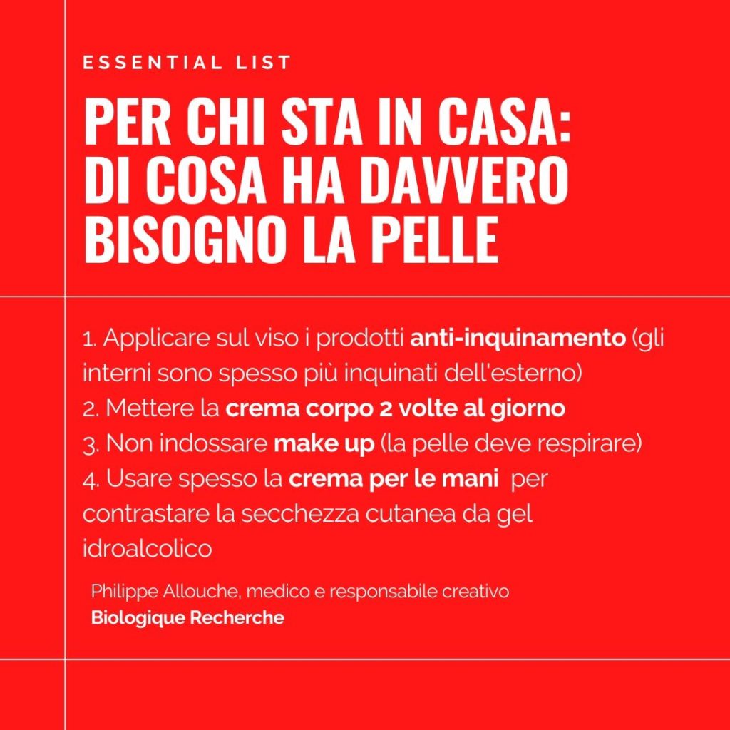 «Una premessa: sappiamo che è un momento difficile dovunque e specie nella nostra amata Italia, giorni pieni di tristezza e stress per le famiglie e l’intera popolazione. Siamo impressionati da come il vostro paese stia lottando per andare avanti con coraggio e compassione e vogliamo dirvi che siamo con voi. In questo momento difficile la pelle è indubbiamente cambiata, perché le nostre vite sono cambiate. La fisiologia dell’epidermide risente di condizioni ambientali, stile di vita, cicli ormonali e altri parametri e si rigenera più di 9000 volte nella vita di ciascuno. Il migliore consiglio che mi sento di darvi è conducete una vita sana: fate quanto più esercizio fisico possibile, cercate di dormire di più, non fumate e prendetevi tempo, ora che lo avete, per una routine di cura della pelle».
