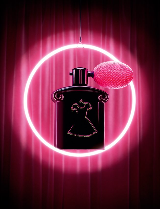 Già il flacone è un belvedere. Di vetro nero laccato con vaporizzatore a pompetta rosa fucsia. Non è liquido, ma c’è il vaporizzatore perché si tratta di una polvere tanto volatile e sottile che si può “spruzzare” , con risultati inebrianti.
