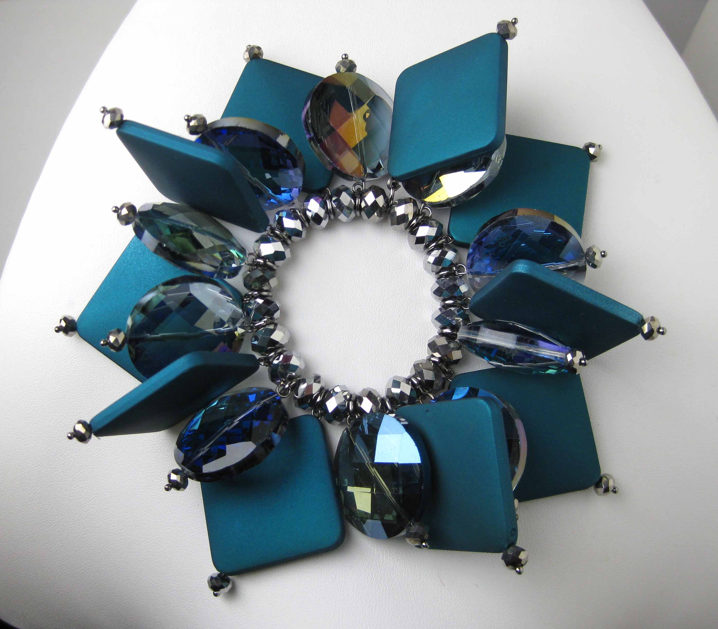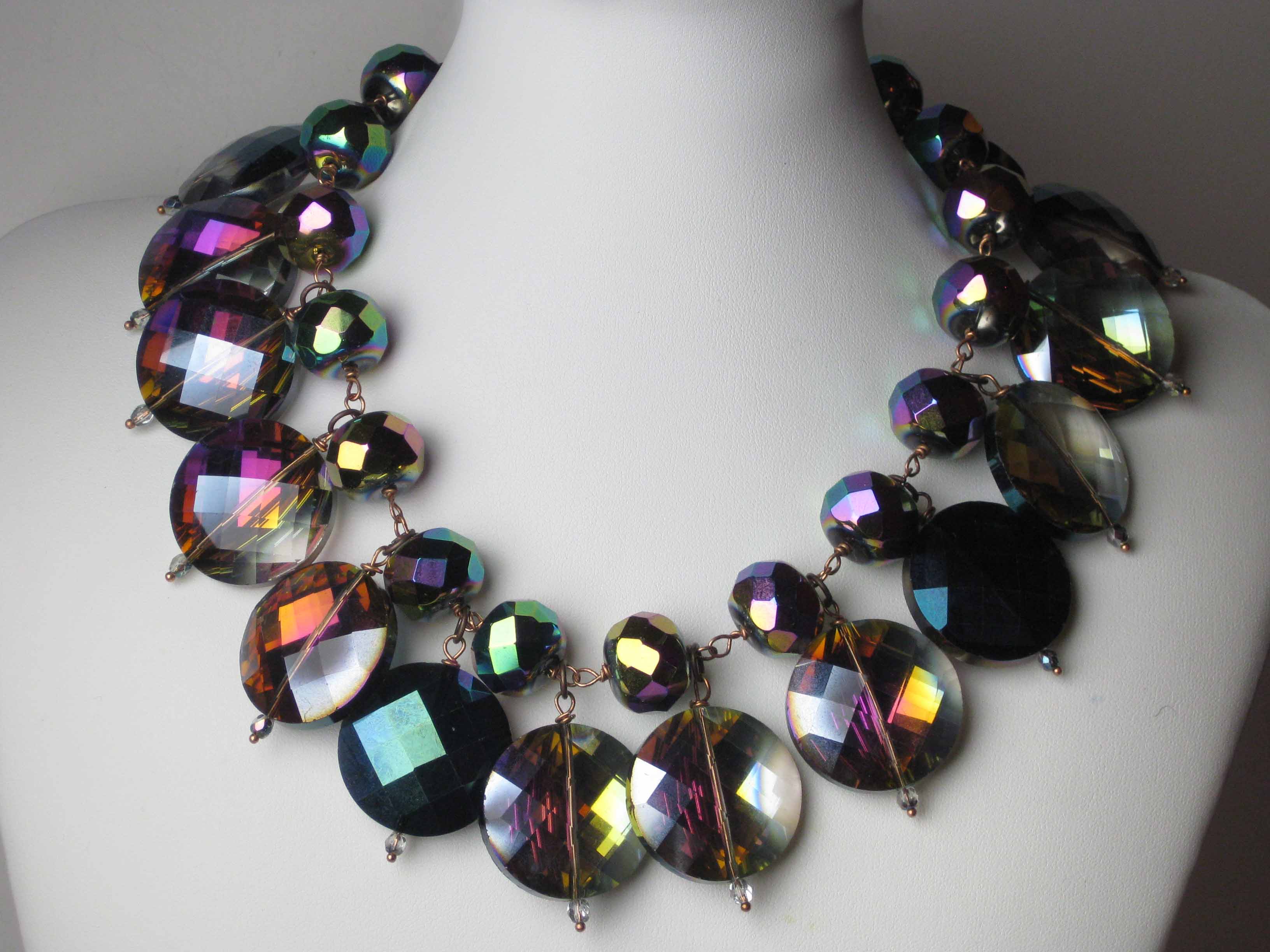 Ho diretto per molti anni una rivista di settore sul gioiello fantasia. Ho avuto, perciò, la possibilità di conoscere e contattare un grande numero di produttori di materiali: catene, cristalli, perle, pietre ecc. In più amo cercare per conto mio le cose che mi piacciono girando qua e là. La creatività segue dei canali molto particolari; non parto mai da un disegno o da un’idea precisa ma molto spesso, guardando i materiali di cui sono circondata nel mio laboratorio, mi viene un idea e collane, bracciali, orecchini si materializzano in maniera facile e naturale seguendo una logica coerente che dà vita alla nuova collezione. L’unico aspetto costante è la tecnica : uso quella dell’incatenamento a mano con filo metallico.
