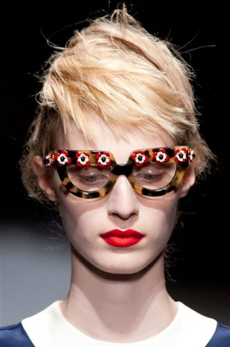 4. *Occhiali naif:* ovvero decorati con margheritine bicolore, che incorniciano la montatura. Un effetto nerd con l’aggiunta di regressione all’infanzia. Prada può. Cura beauty: siero contorno occhi e extension alle ciglia.