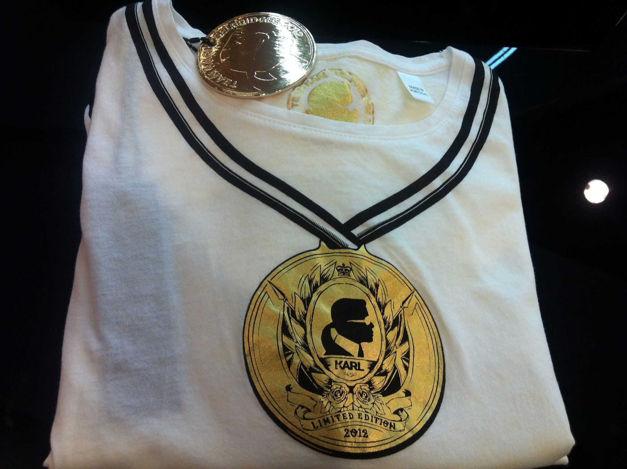 24 luglio. -3 giorni alla cerimonia di apertura. Giorno zero per la cerimonia di apertura del pop up store dedicato alla linea Team Karl. Se le Olimpiadi sono il motivo che porta Kaiser Karl a dare al mondo fashion e alla fashioniste più o meno convinte una linea limited edition neanche troppo vagamente ispirata ai Giochi (altrimenti la T-Shirt con medaglia aurea stampata come me la spiego?) allora vanno benissimo. God bless lui. E i London creativi di I Love Dust con cui ha disegnato la T-shirt.
