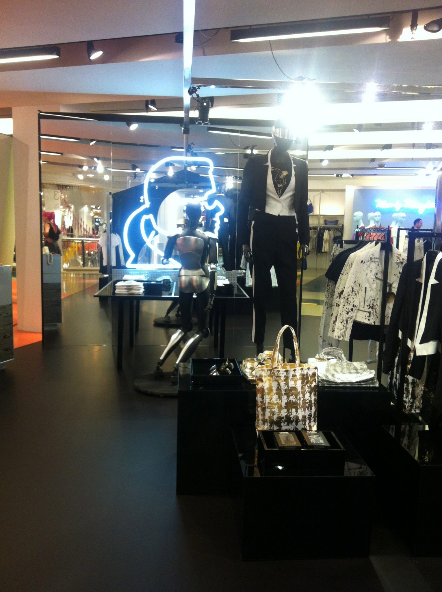 Il resto? Karl allo stato purissimo. Colletti, segno distintivo inconfondibile del Lagerfeld style; skinny jeans con spruzzatina aurea pure quelli; giacchine, shopping bag in tela parzialmente aurea. E’ tutto. Tutto, volendo escludere le vetrine personalizzate, il profilo di Karl in ogni dove e la possibilità di portarsi a casa un delizioso tattoo temporaneo con il suddetto profilo a memoria non perpetua dell’evento. La moda passa, lo stile resta, le decalcomanie si cancellano. E, per Karl, però, è subito medaglia d’oro.