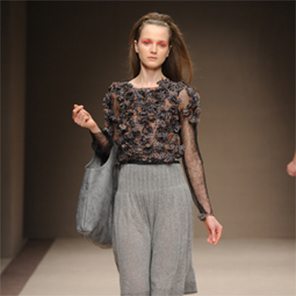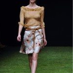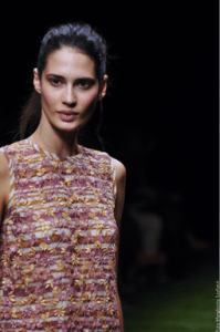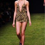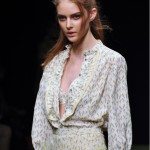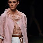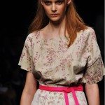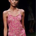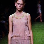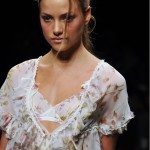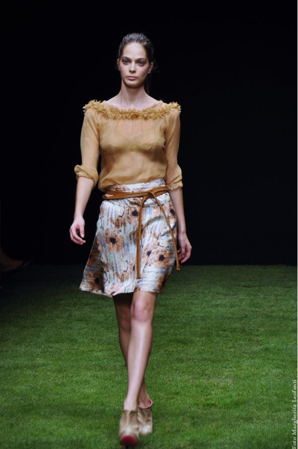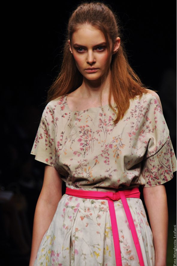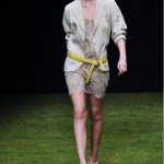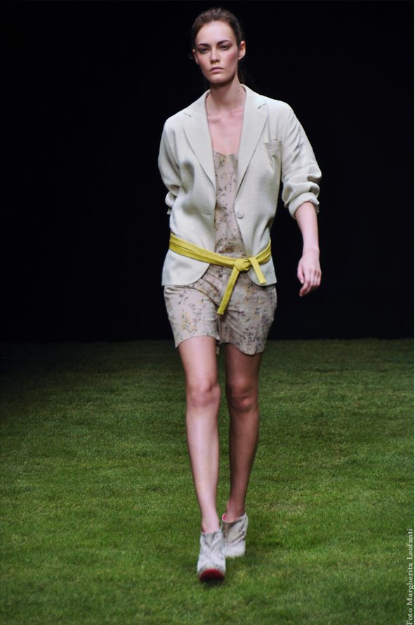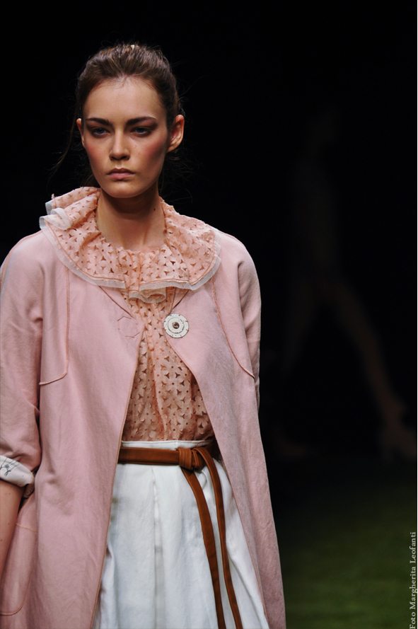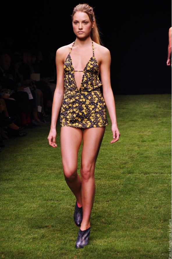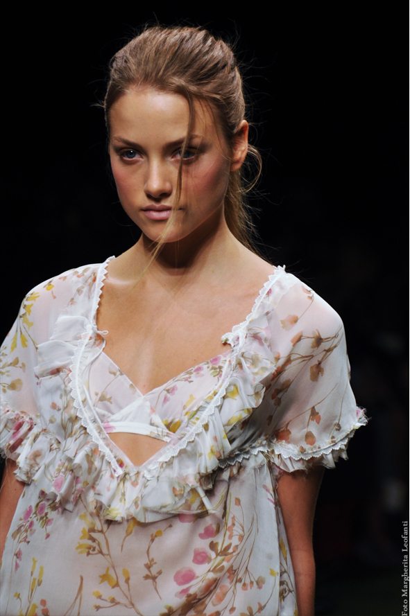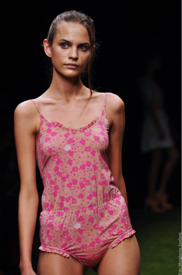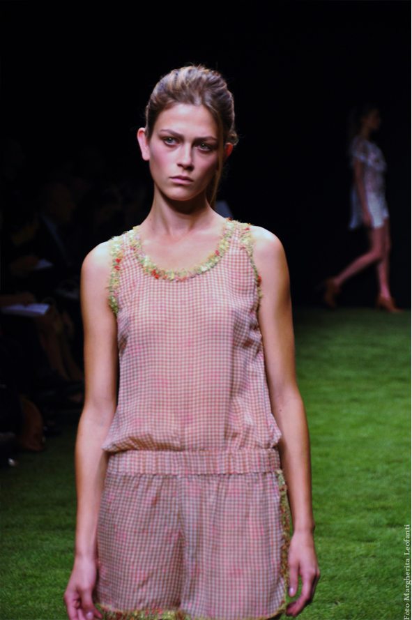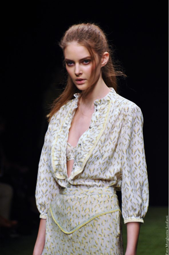 Tutto è lieve e leggero in questo ballo a piedi nudi sull’erba. Sfilano ragazze dall’aria ingenua con abiti in georgette delavè , costumi da bagno che sarebbero piaciuti alla nostre mamme e pantoloni a cinque tasche in chiffon con rifiniture “a crocchetta”.