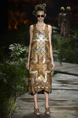 E’ quello di legno intarsiato di Ronaldo Fraga. Una tunica di losanghe di legno madreperlato che disegnano un intarsio sul davanti e riprendono il motivo a intreccio dei sandali. Mi piace moltissimo. Un buon motivo per vedere la San Paolo Fashion Week.