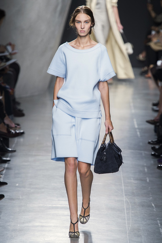 Per il ristorante La Piscina, con interior nei colori crema e celeste e vista sull’acqua, il completo bermuda e T-shirt con scollo a barca di Bottega Veneta. Fresco, sensuale, disimpegnato senza essere troppo casual. Bellissime le scarpe, con cinturino alla caviglia.