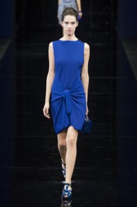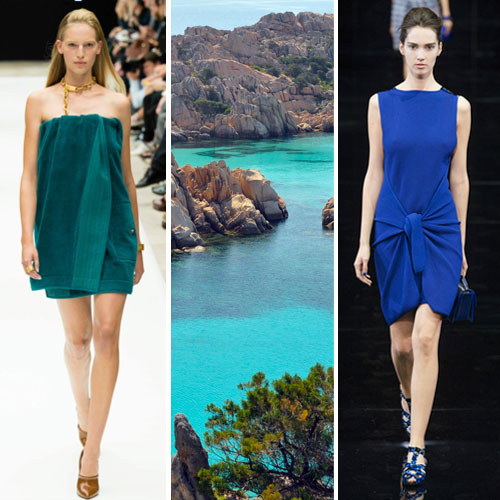 Infine, per la sera, consiglio l’abito blu acceso di Emporio Armani, con drappeggio e sandali bijoux, che si intonerà ai cieli cobalto della Sardegna e sarà perfetto (come i capelli raccolti) per la cena di diverse portate al ristorante La Terrazza.