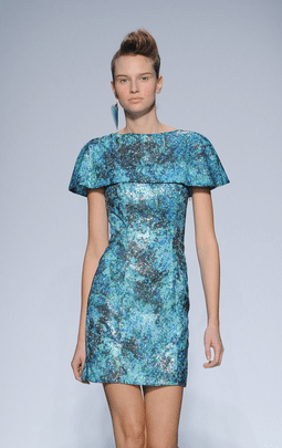 Il Tubino impressionista. Il pointillisme turchese di paillettes si appropria del tubino dal taglio obliquo con mantellina coprispalla incorporata.