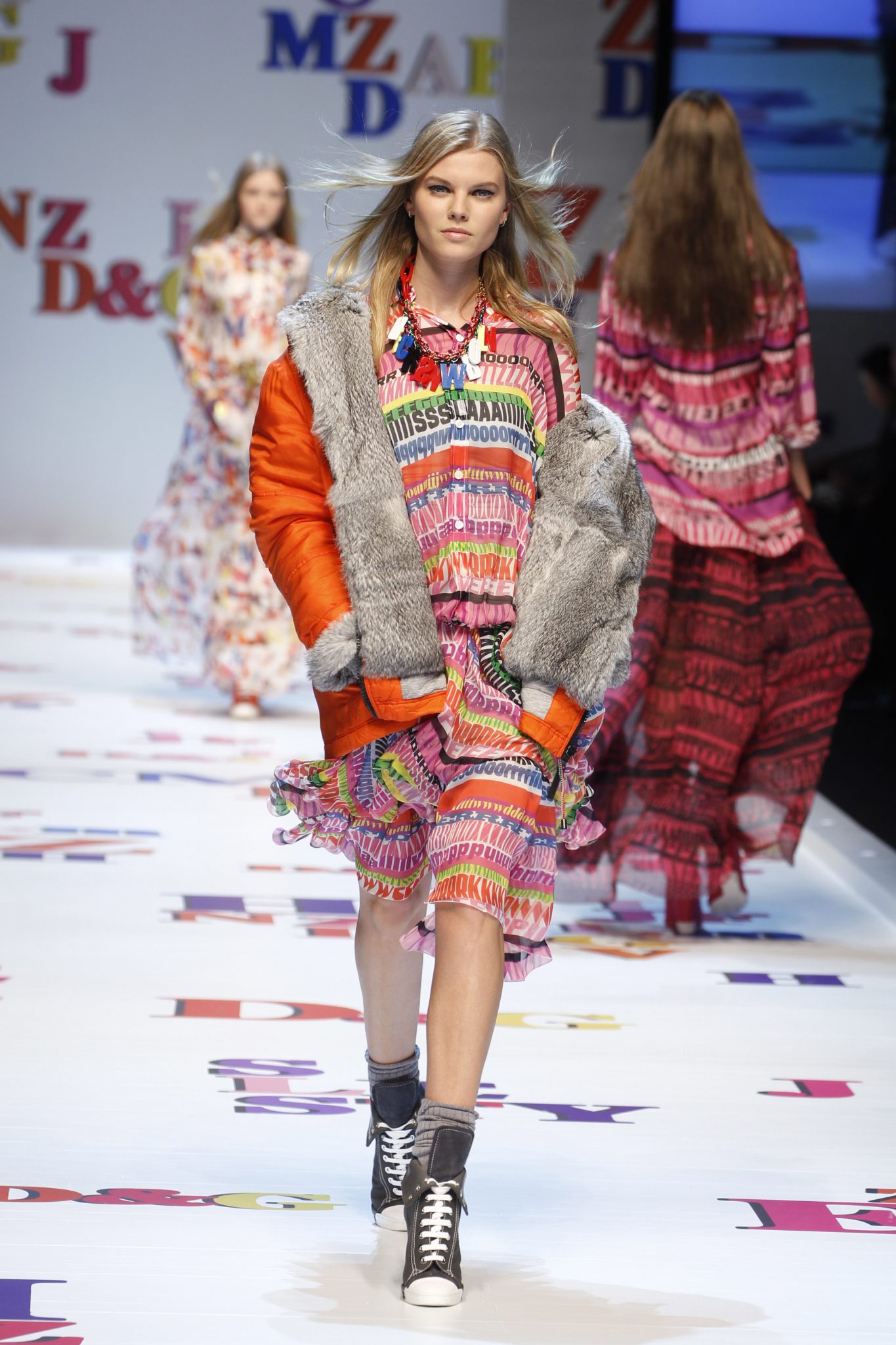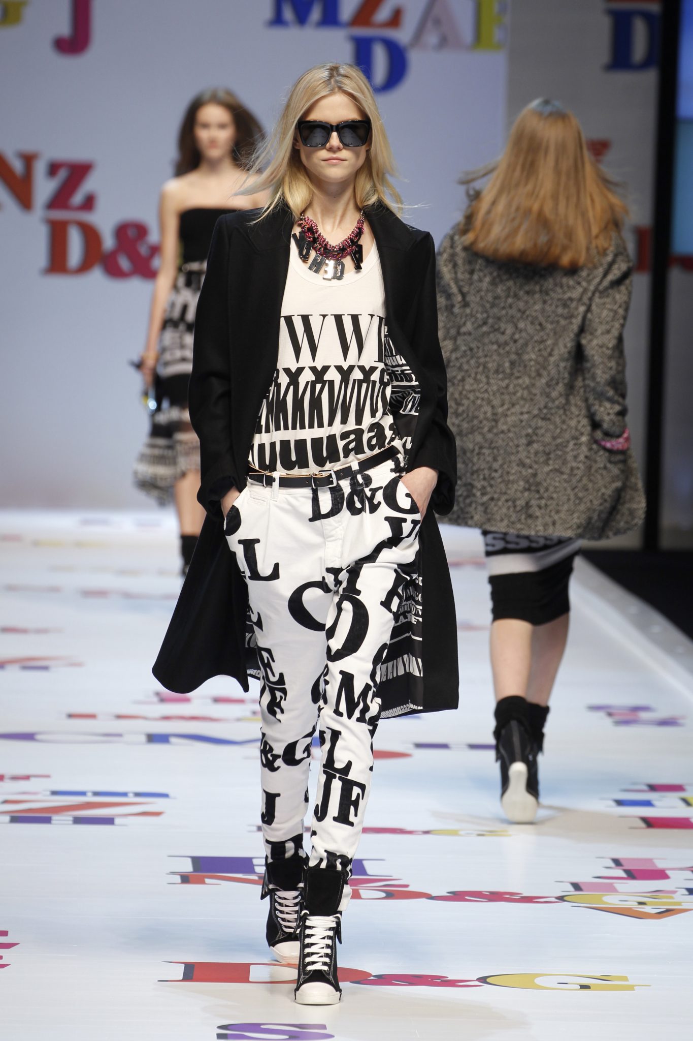 A, B, C, D & G. Il lettering è la nuova D&G-mania. E’ stampato ovunque su felpe, maglie di lana infeltrite dai cui sbucano gonne in chiffon, gonne a tubo fino al ginocchio, panta skinny e bijoux. Fa eccezione la giacca dal taglio maschile, ma la medaglia ha sempre due facce: date un’occhiata al risvolto.