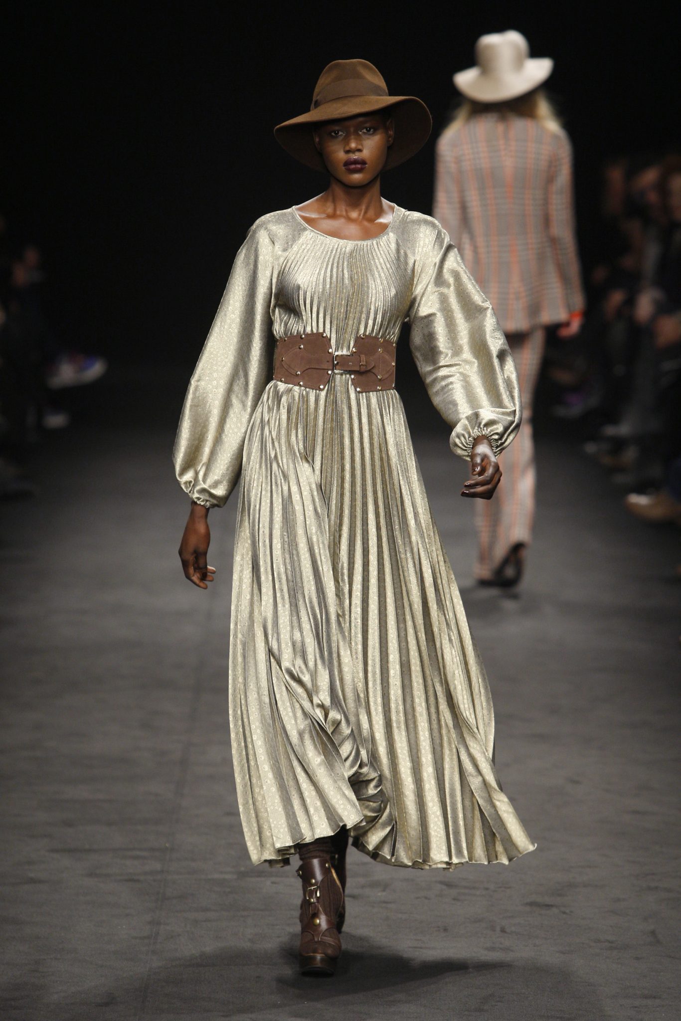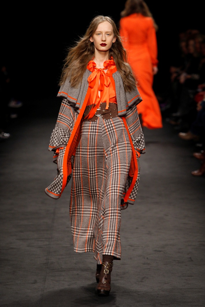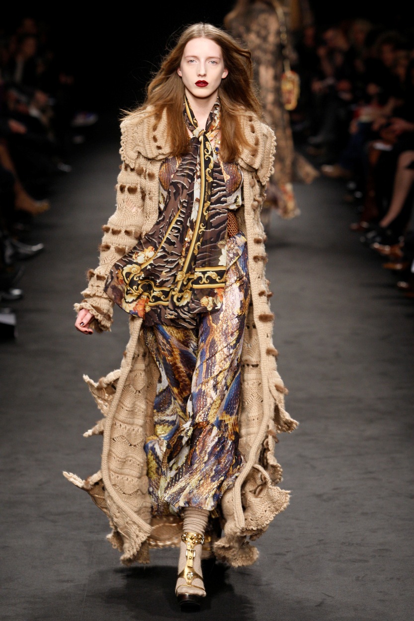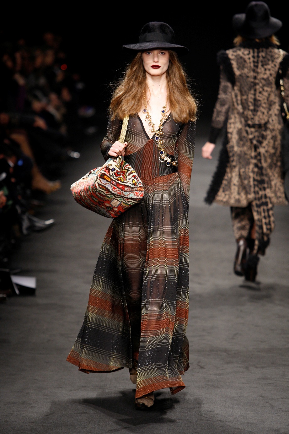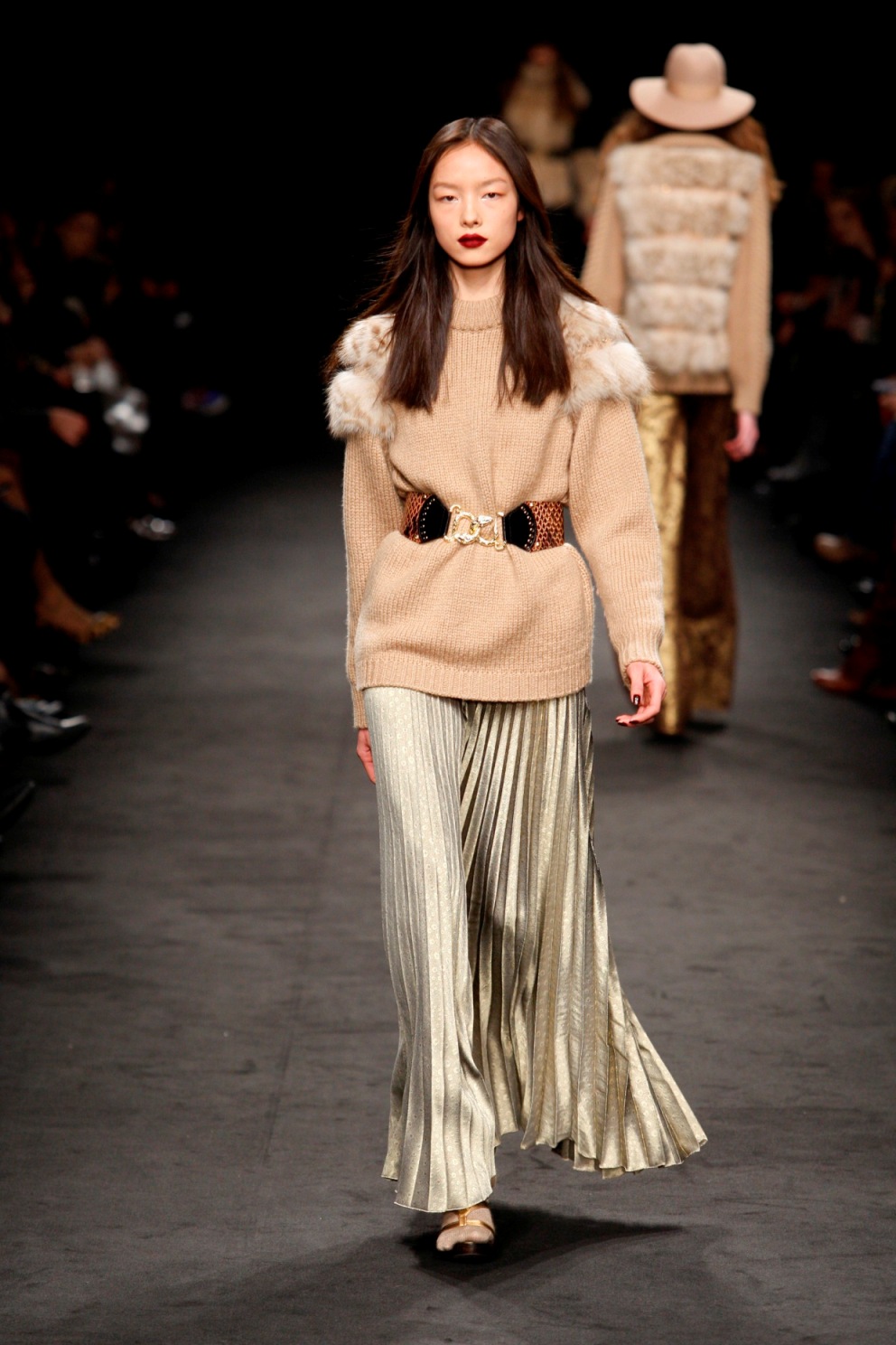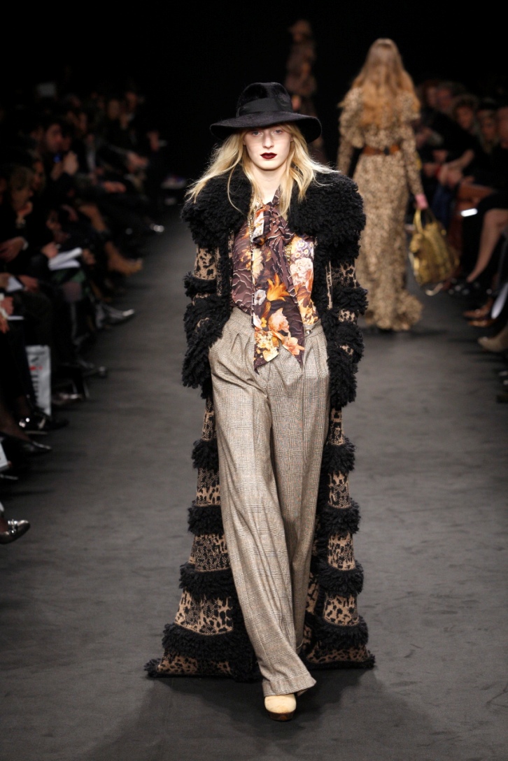 Woodstock. Non ci saremmo sorpresi se, accanto a Chiara Ferragni, avessimo trovato, seduto in prima fila, Jimi Hendrix con la sua chitarra. E’ assolutamente figlia dei fiori la donna di Angelo Marani per il prossimo Autunno/Inverno. Una profusione di pantaloni ampi o a zampa, gonne e abiti lunghi, abbinati a maxi cappotti a balze in maglia di cashmere. Pesca nell’armadio della mamma sessantottina: molti foulard, uno sopra l’altro, a cui sono intrecciate collane di pietre dure e luminose, cappelli per proteggersi dal freddo e gilet di pelliccia. Il freakettonismo imperante nella collezione viene mescolato a sorpresa ( e che sorpresa! ) con elementi ultra luxury come i tessuti in broccato color oro o ricoperto da una pioggia fitta di paillettes. E poi ancora stampe geometriche, leopardate, zebrate, pitonate audacemente mixate insieme…ma non s’era detto che “Less is more”?