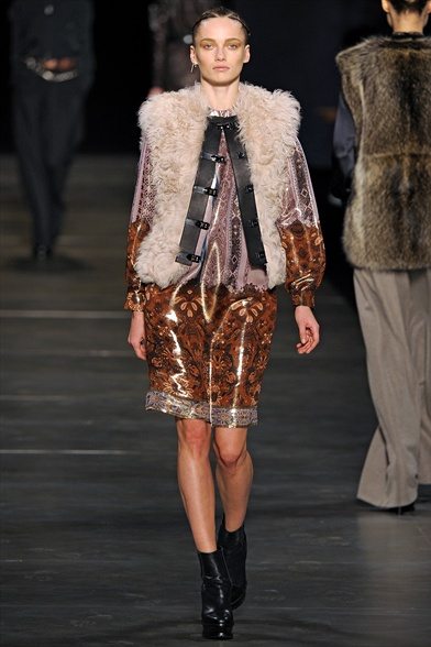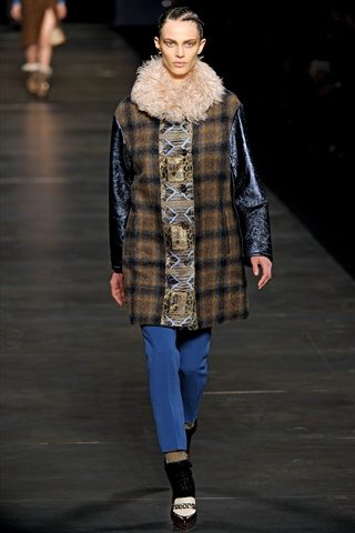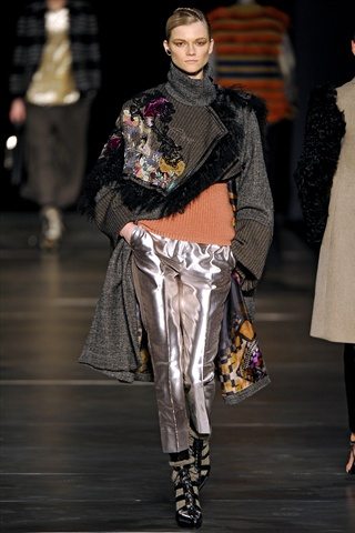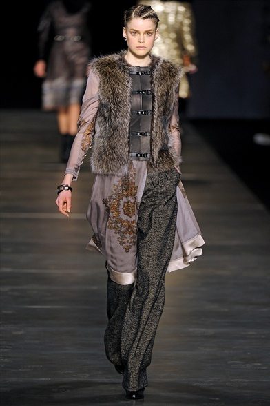 L’ispirazione viene dalle antiche civiltà (Gilet di frange colorate e pellicce di lana o tuniche con dettagli in agnellino e stampe degli arazzi su gonne e maglie ), e dall’età del ferro. La donna pensata di Etro è un iron girl, una donna Highlander, forte, audace e nel contempo femminile. Per forza, con i tempi che corrono, e questi uomini sempre più in balia degli eventi, qualcuno deve pur tirare fuori la grinta. E tocca a noi. Riflessi metallici su pantaloni, gonne ricordano il colore del ferro, così come anche le cinture lucenti.