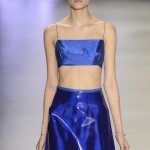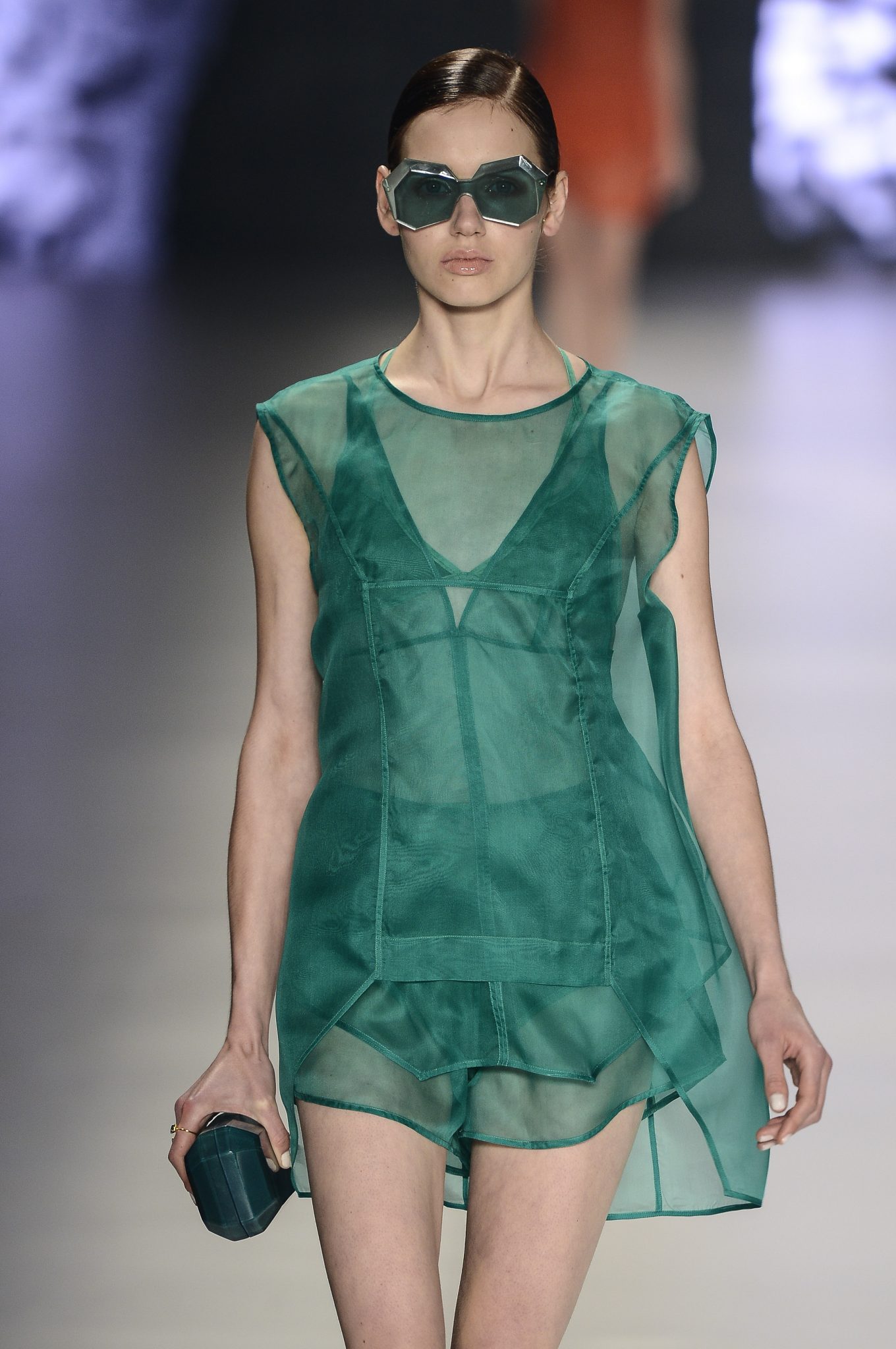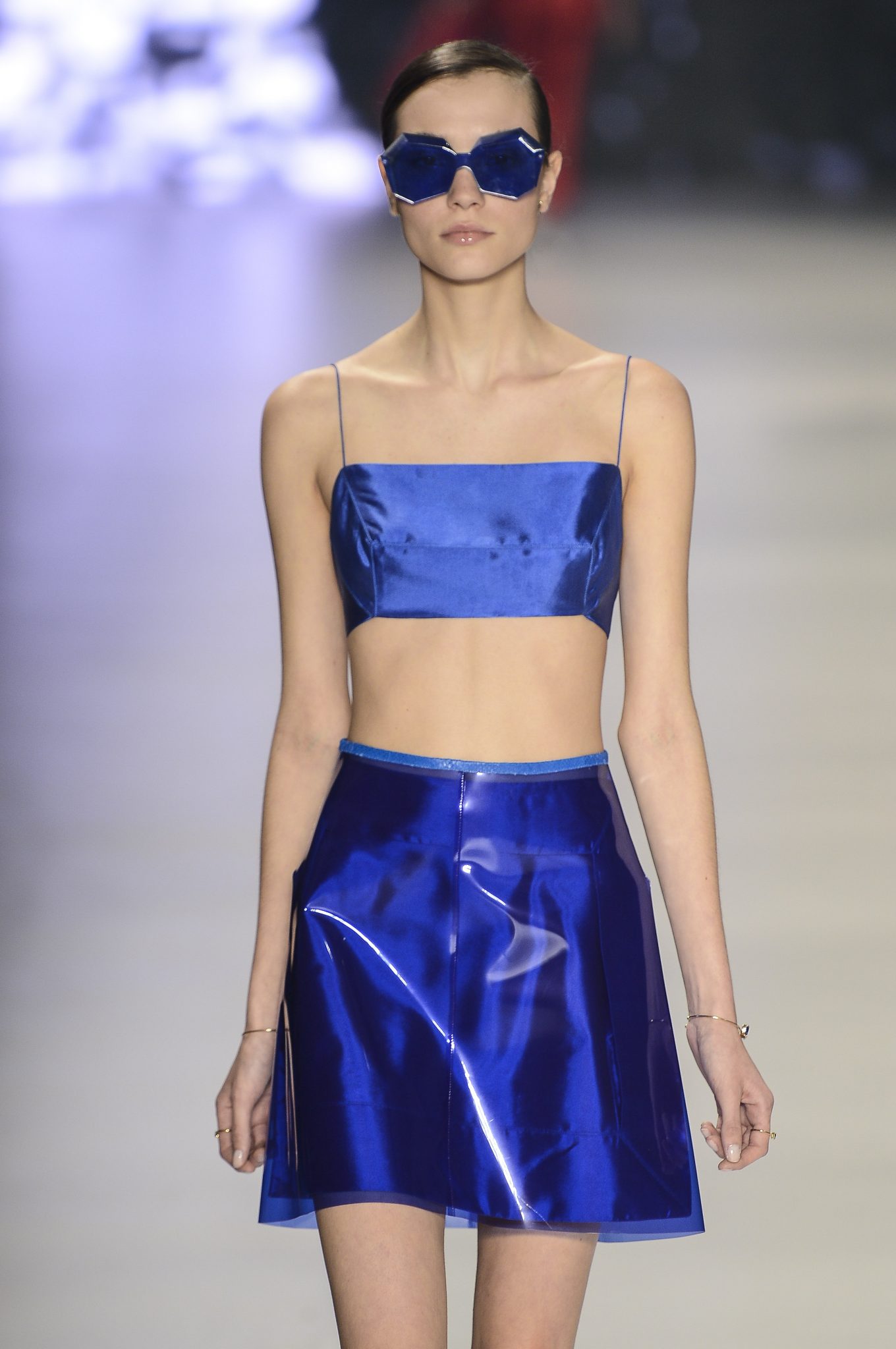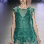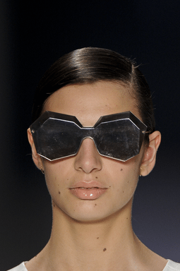 A specchio, e sfaccettati come diamanti. Gli occhiali della sfilata di Oklen sono l’accessorio da avere. In metariale plastico riflettente e trattato in modo da essere a specchio, sono declinati in più colori a seconda del look, bluette con la gonna doppiata in pvc, leggermente dorati con il grembiulino di seta grezza. Bella collezione.