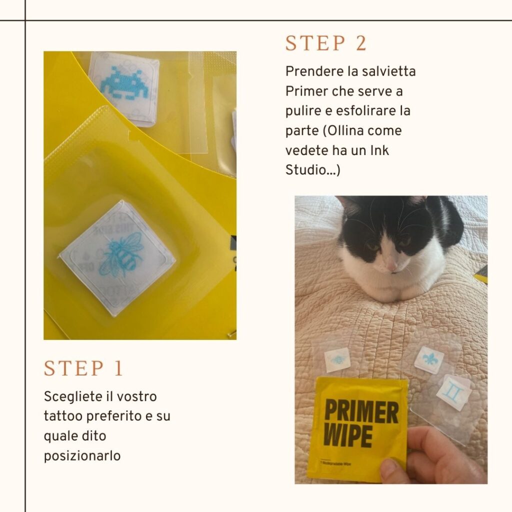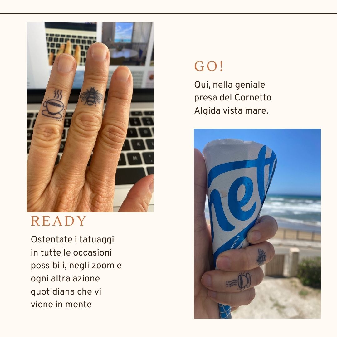 Ho visto i tatuaggi di Inkbox su Instagram. Sono tattoo temporanei (loro dicono semi-permanenti) che durano circa 10 giorni ma sembrano, almeno nella prima settimana, assolutamente frutto di ago e inchiostro. Il marchio è stato fondato nel 2015 da due fratelli canadesi, Tyler and Braden Handley, oggi milionari, che spediscono la possibilità di accedere alla body art (questo è il tatuaggio) da casa propria a milioni di persone. La differenza sta, oltre che nello stile (veramente contemporaneo, prova ne è la collaborazione con giovani artisti) nel risultato: non disegni stile trasferelli da bambini, ma tratti che replicano in modo impeccabile quelli dei tatuaggi fatti in studio (ma, altro benefit, senza dolore). Volevo provare, non tanto per convertirmi poi al permanente ma come forma di decoro, al posto di un accessorio o un anellino. Ne ho ordinati una decina, ma vi assicuro che tutti i disegni dei tatuaggi più piccoli – potete posizionarli dove volete – erano bellissimi: lettere, cuori, api, gigli fiorentini, tazzine di caffè fumanti, segni zodiacali, mostri di space invaders, scritte. Alla fine il mio bottino era di 9 tattoo per un totale di 48 euro (anche perché se aggiungi dei pezzi ti scontano o regalano un altro tatuaggio e uno tira l’altro, come le ciliegie). La buona notizia è che ci hanno messo circa 5 giorni ad arrivare dal Canada (l’azienda è di Toronto), la cattiva è che il messaggio ricevuto sul telefono mi avvertiva che c’erano 26 euro di spese di dogana da aggiungere. Ma si può essere tanto idioti? Potevo comprarne il doppio, almeno ammortizzavo. Arrivano in una busta di carta con banda gialla, ogni tatuaggio in una bustina di plastica rigida singola e con una salvietta primer con cui detergere la parte dove volete applicarlo. Nelle prime ore il disegno è blu ma in 24 ore diventa nero e dà il meglio di sé.