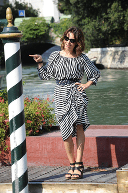 Mille righe decorato l’abito di Moschino con maniche a tre quarti che ha indossato Violante Placido al suo arrivo al Lido per la Mostra del Cinema. Cintura borchiata e sandalo con la zeppa hanno poi fatto il resto.